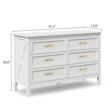 The Riumlore White 6-Drawer Dresser combines a crisp white finish with brushed gold handles for a modern yet timeless look. Perfect for bedrooms or living rooms, its six spacious drawers provide organized storage for clothes, linens, and everyday essentials.