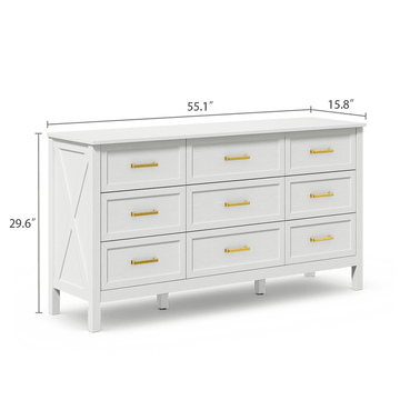 The Riumlore White 9-Drawer Dresser combines a white finish with brushed gold handles for a farmhouse yet timeless look. Perfect for bedrooms or living rooms, its nine spacious drawers provide organized storage for clothes, linens, and everyday essentials.