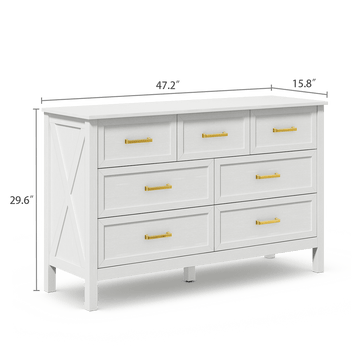 The Riumlore White 7-Drawer Dresser combines a crisp white finish with brushed gold handles for a modern yet timeless look. Perfect for bedrooms or living rooms, its seven spacious drawers provide organized storage for clothes, linens, and everyday essentials.