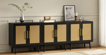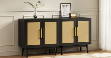 This modern rattan sideboard/TV stand features natural cane doors, gold handles, and a clean silhouette—available in black. The blend of organic texture and sleek design fits perfectly in boho or modern interiors.