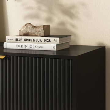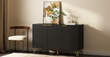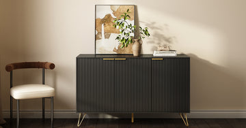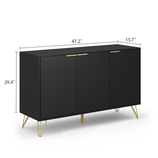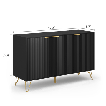 Upgrade your space with a modern 3-Door sideboard/TV stand that blends style and smart storage. This black storage cabinet features a fluted front, push-to-open doors, and gold hairpin legs, perfect for any contemporary room. Use it as a dining room sideboard, entryway cabinet, or office storage; it adapts with ease.
