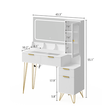 The Riumlore Modern Vanity combines elegance with everyday function. Featuring a white finish, gold accents, and a lighted mirror with three adjustable color settings, this vanity brightens your beauty routine while elevating your space.
