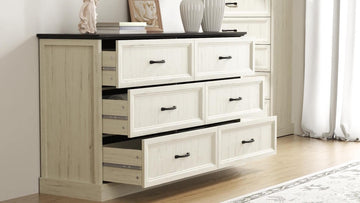 Add timeless farmhouse charm to your bedroom or living room with the Riumlore Rustic White 6-Drawer Dresser. Built from warp-resistant wood with smooth metal glides and black handles, this 6-drawer dresser offers practical storage and rustic warmth for any space.