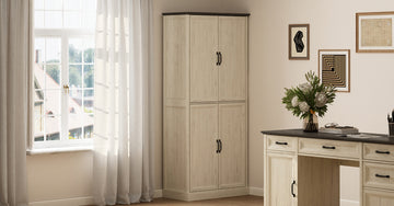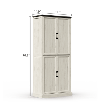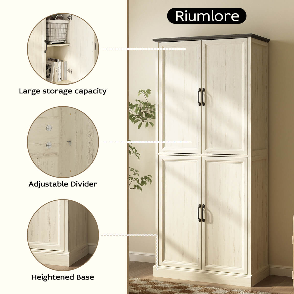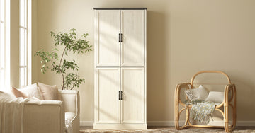 The rustic cabinet with white wood grain finish offers timeless style and practical storage. Featuring a tall four-door layout and adjustable shelves, it’s perfect for organizing clothing, linens, and essentials.