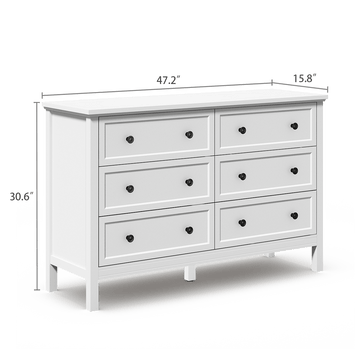 Crafted from durable engineered wood, the 6 spacious drawers glide smoothly,ideal for organizing clothes, linens, or daily essentials in the bedroom or living room. Classic black knobs offer a subtle contrast and a touch of rustic charm.