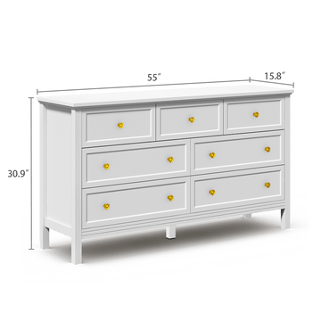 Refresh your bedroom or living room with the Riumlore 7-Drawer Dresser. This modern dresser features a clean white finish, gold knobs, and a bright, airy look. Seven drawers — three small and four large — provide organized storage for clothes, linens, and daily essentials.Smooth glides ensure easy use, and the wide top holds lamps or decor. Comes with anti-tip hardware for added safety.