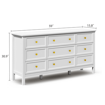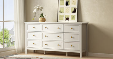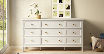 Refresh your bedroom or living room with the Riumlore 9-Drawer Dresser. This modern dresser features a clean white finish, gold knobs, and a bright, airy look. Nine drawers — three large and Six small, provide organized storage for clothes, linens, and daily essentials.