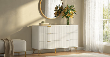 Bring calm and texture to your bedroom or living room with the Riumlore Modern Fluted 6-Drawer Dresser. With fluted drawer fronts and gold-finished handles, this modern dresser combines warmth and clean design. Six spacious drawers offer easy storage for clothes, sleepwear, or linens, while smooth glides ensure effortless use.