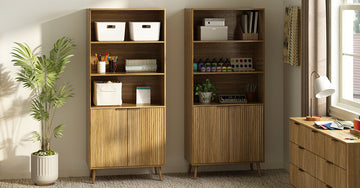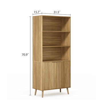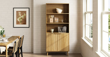 Crafted with a warm oak veneer and clean fluted design, this mid-century modern bookcase pairs open shelving with a hidden cabinet for both display and storage.